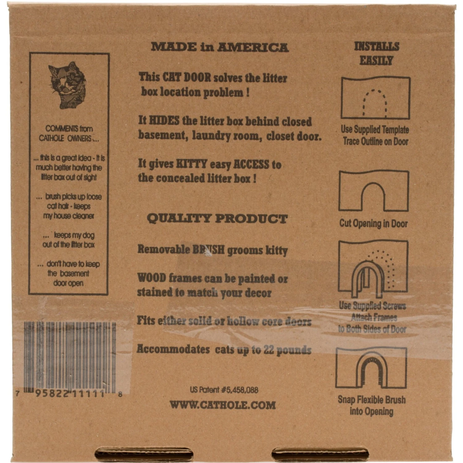 - This cat door has a removable brush that grooms kitty as they enter and exit their area, and accommodates cats up to 20 pounds in size.