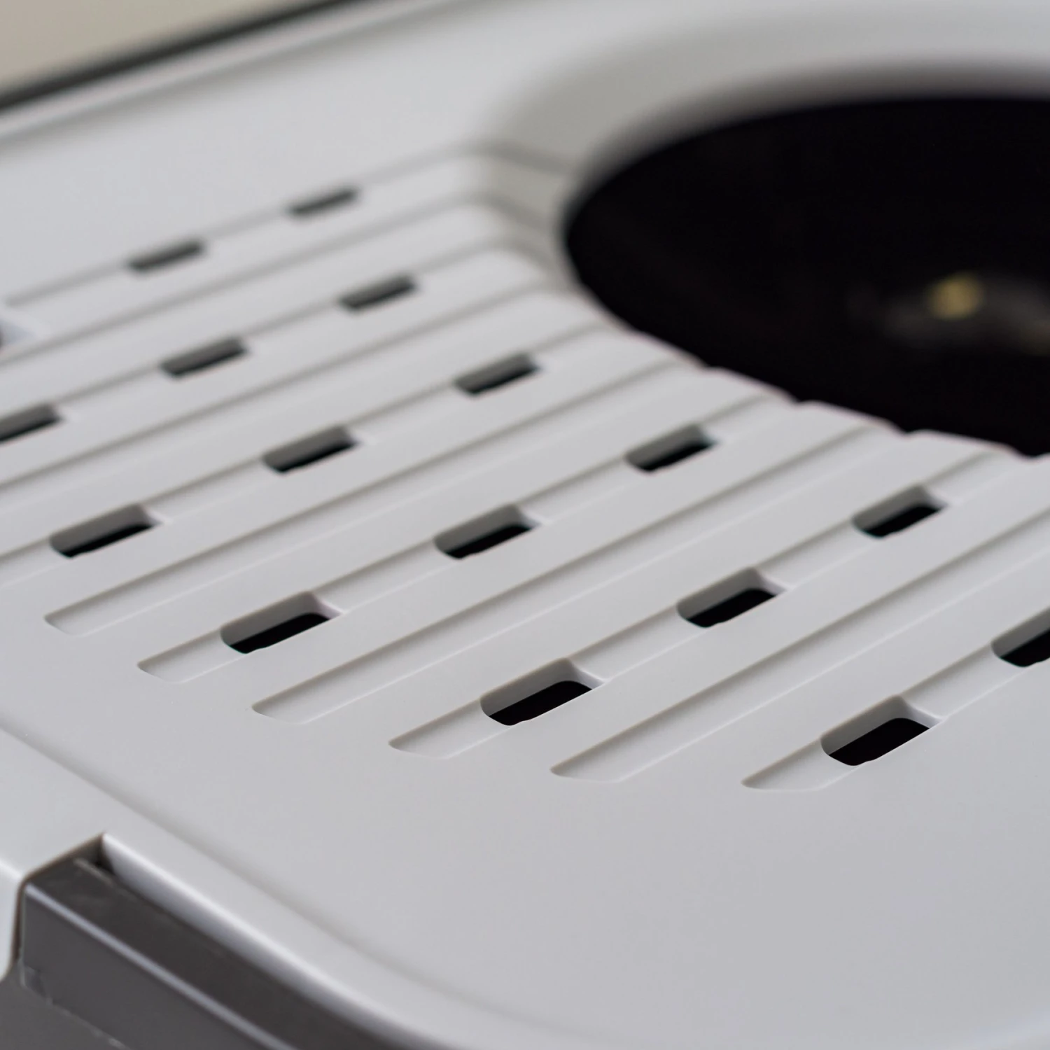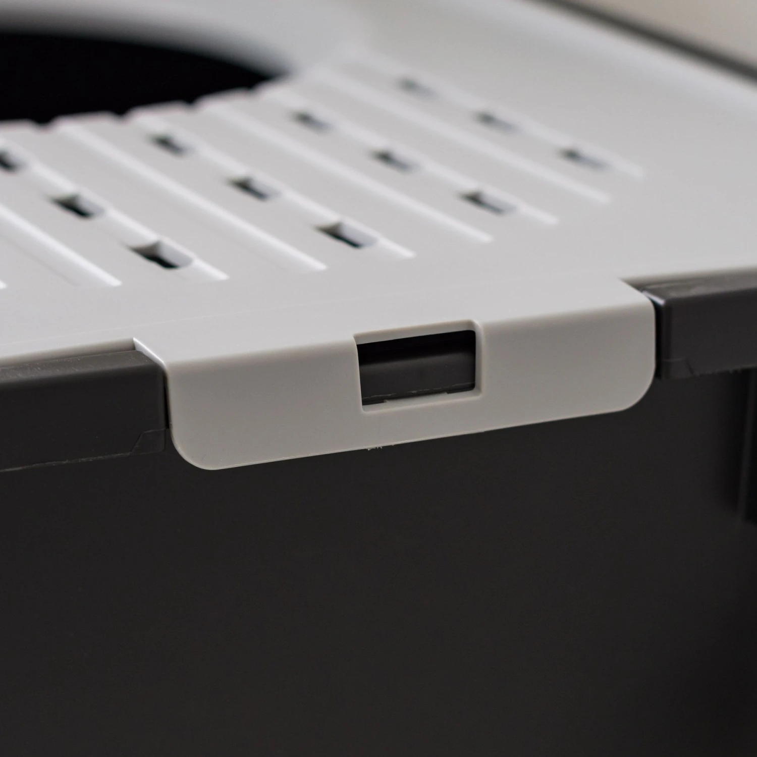 - Grooves in the lid catch lingering litter particles on paws to help keep the area neat.