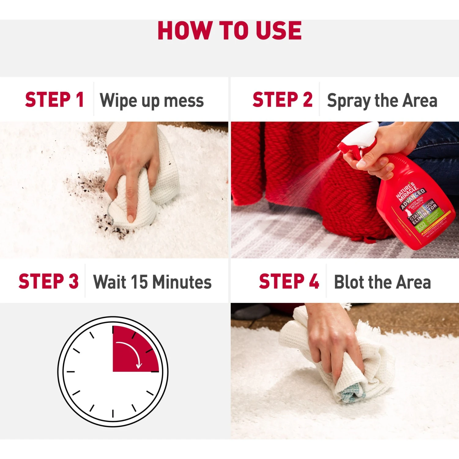 - Also works to discourage re-soiling by removing the odor of pet messes.