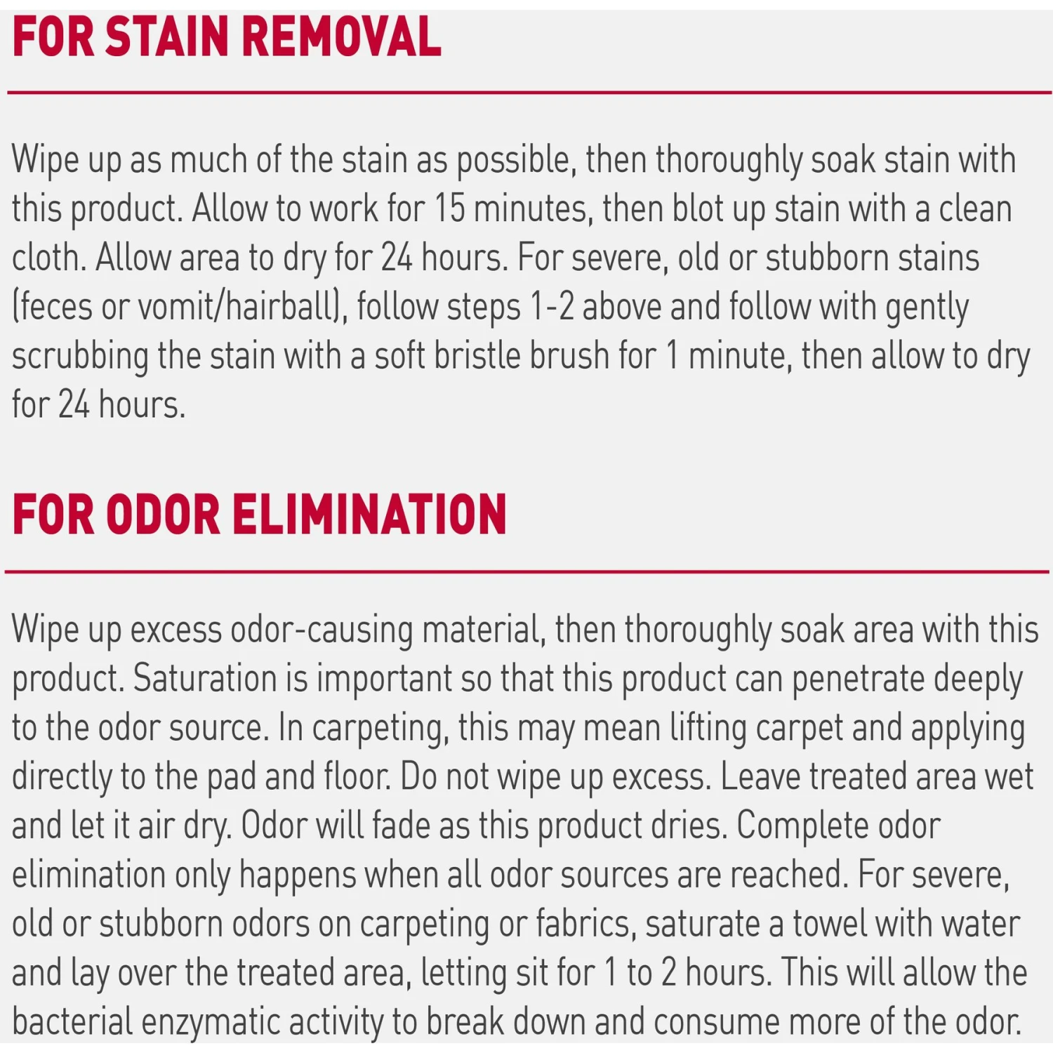 - Works to eliminate severe stains and odors including urine, diarrhea, vomit and blood.