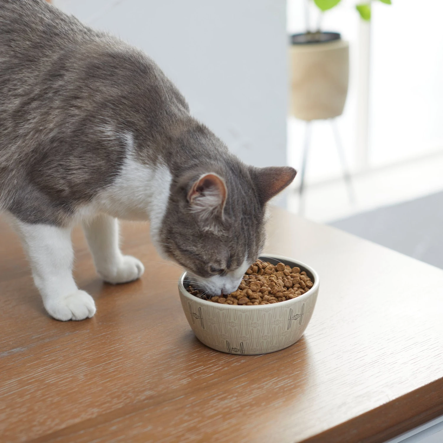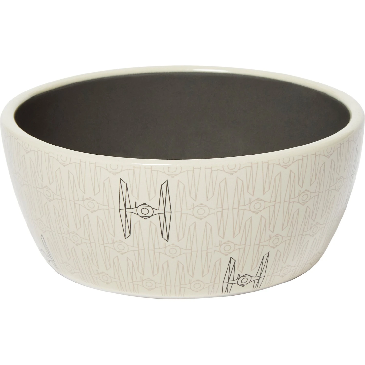 - Modern-style cat bowl with a STAR WARS-themed Tie Fighter pattern.