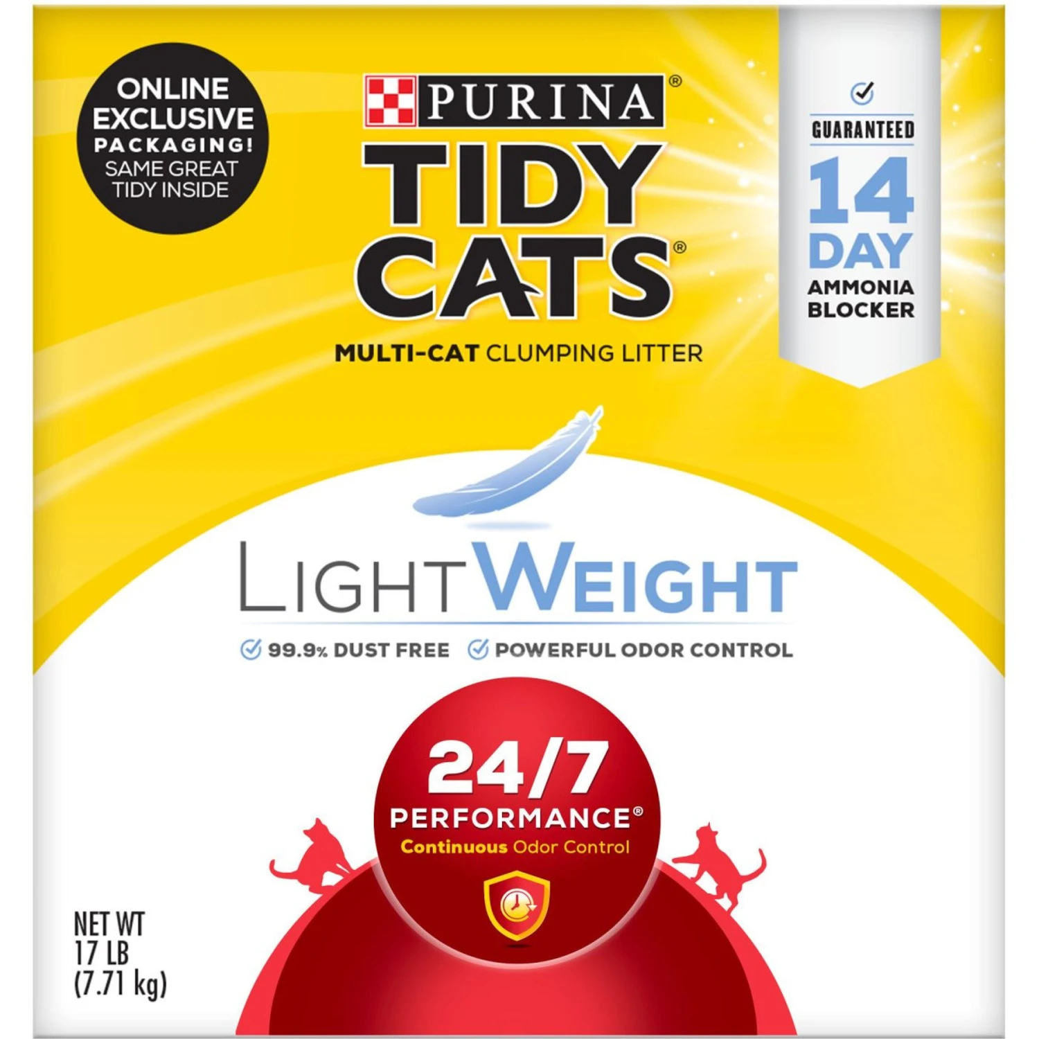 Meet the litter that works as hard as you with Purina Tidy Cats LightWeight 24/7 Performance Clumping Cat Litter. This scoopable clumping cat litter provides triple-odor protection, all day and all night. A slow-release deodorizing system gives you continuous odor control, and Ammonia Blocker stops ammonia odor from forming for 14 days when used as directed. Even better, this scoopable litter lightens your load when it comes to litter box chores. The lightweight clumping litter weighs half as much as leading clumping cat litter, making it easy to carry and pour. The patented granules absorb moisture and form tight clumps that are easy to scoop. Plus, this multi cat kitty litter is low dust for a clean pour into the litter box. A clean linen scent leaves behind pleasant fragrance, helping you keep your home smelling fresh. Make the litter box a comfy place for kitty while enjoying protection from lingering odors with this odor control cat litter.